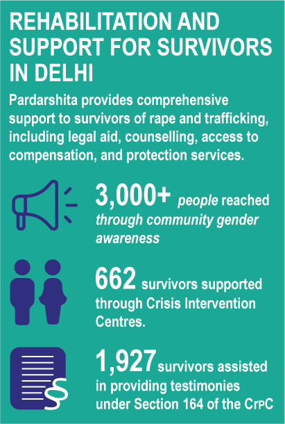 In Delhi, Pardarshita provides rehabilitation support to survivors of rape and trafficking, many of whom have been pushed into sex work. Our support includes legal aid, counselling, access to compensation, and protection services. These efforts are not only about addressing immediate needs but also about helping survivors live with dignity, safety, and justice.